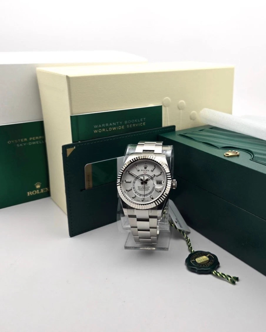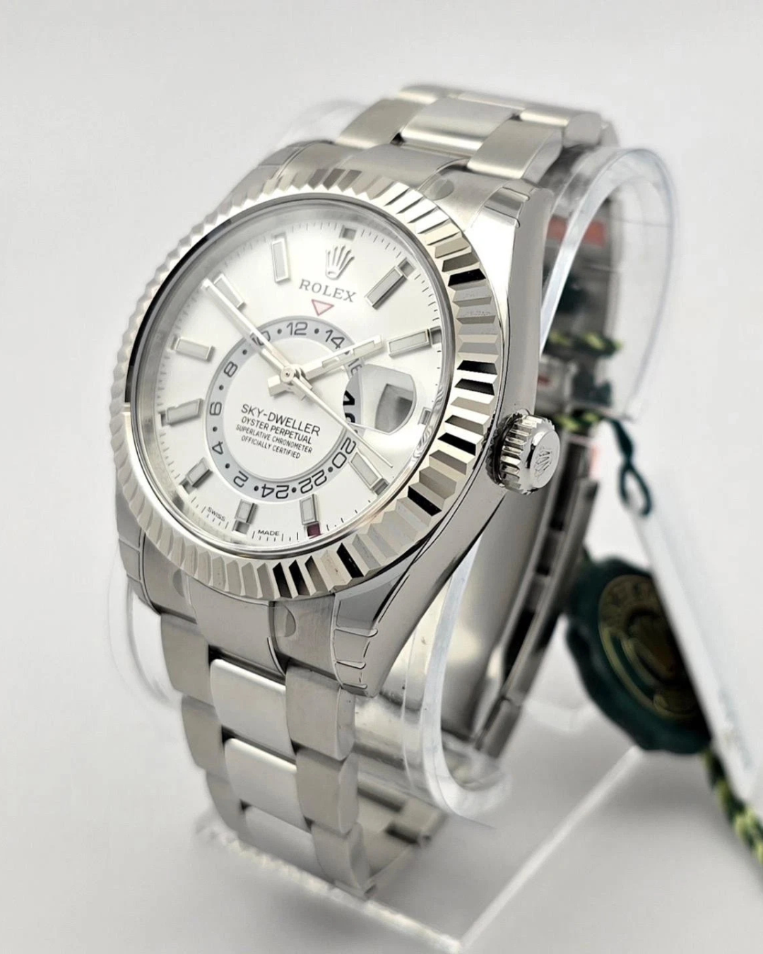 El Rolex Sky-Dweller 326934 es una pieza excepcional pensada para viajeros frecuentes que buscan elegancia sin renunciar a la funcionalidad. Esta versión combina el acero Oystersteel con un bisel estriado en oro blanco de 18 quilates, además de una pulsera Jubilee que realza su sofisticación. Equipado con el calibre automático 9001, ofrece una de las complicaciones más útiles de la relojería moderna: segundo huso horario con lectura 24 horas y calendario anual. Su diseño limpio con esfera blanca sin cifras lo convierte en un reloj atemporal y potente.